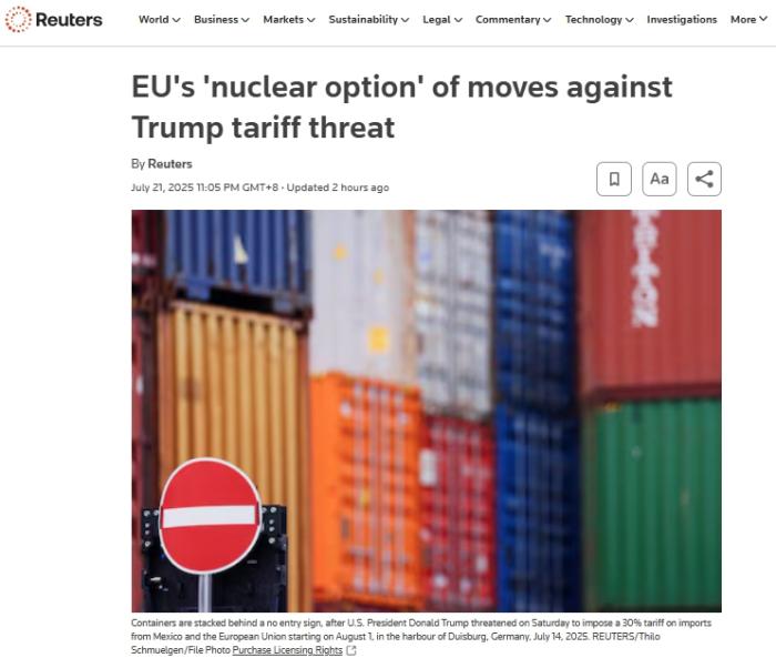 欧盟或考虑对美关税启动“终极威慑”手段