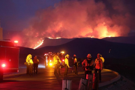 1月22日,在美国加利福尼亚州洛杉矶县卡斯泰克市的一座山丘上,消防员与名为“休斯”的山火奋力搏斗。新华社发(邱晨摄)