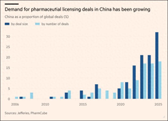 美国投资银行杰富瑞集团本月发布的一份报告显示,今年截至目前,在与全球跨国制药公司达成的授权交易中,中国创新药企的数量和金额占比都创下历史新高。英国《金融时报》7月22日评价,这凸显出即使面临美国关税压力,大型跨国药企仍正越发倚重中国创新药企。