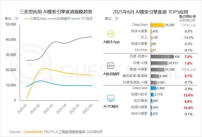 赛道规模数据更显眼的是AI插件,因为原生App被越来越多的传统App以接入DeepSeek的形式分流,所以从数据上,AI插件的规模增长趋势高于AI原生App和AI PC网页两种应用类型。从AI应用插件的规模上看,百度AI、抖音AI搜和微信AI搜,分别占据前三强的位置。