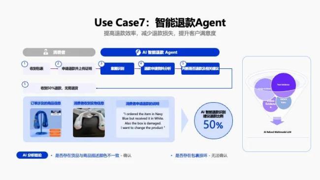 而在阿里自身的体系内,也开始了Agent的落地实践,比如阿里国际推出的智能退款Agent,可以快速灵活地让用户满足退款的诉求,也极大地降低商家的售后成本,阿里国际方面公布的数据是纠纷处理时长节约了30%,降低退款成本15%。
