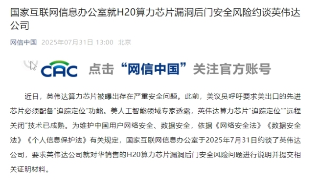 网信中国方面表示,为维护中国用户网络安全、数据安全,依据《网络安全法》《数据安全法》《个人信息保护法》有关规定,国家互联网信息办公室于2025年7月31日约谈了英伟达公司,要求英伟达公司就对华销售的H20算力芯片漏洞后门安全风险问题进行说明并提交相关证明材料。