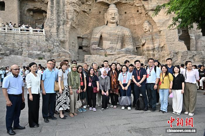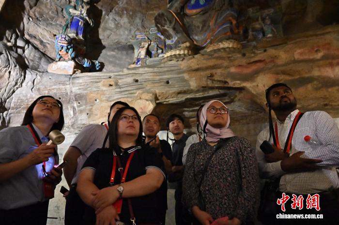 8月6日,山西省大同市,来自16个亚洲国家的18位驻华外交官参观访问世界文化遗产云冈石窟,交流文化遗产保护和传承的经验。中新社记者 韦亮 摄
