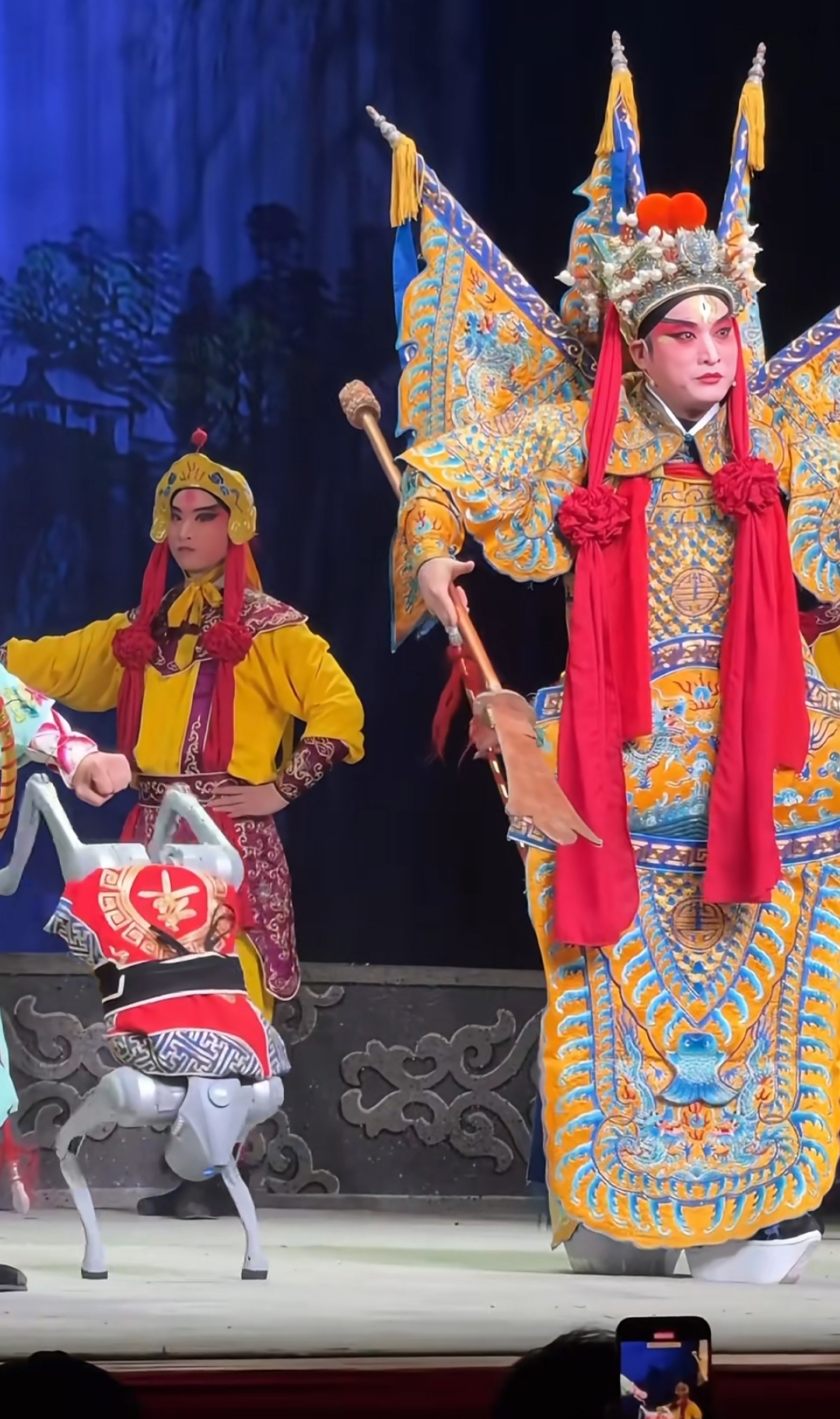 当传统戏曲拥抱现代科技,更碰撞出新火花。浙江婺剧团在《三打白骨精》中,让无人机“扮演”孙悟空变化的“小蜜蜂”,在舞台空间灵动飞舞,为经典情节平添几分科幻奇幻色彩;浙江中月婺剧团则在折子戏《虹桥赠珠》中,创新性地让机器狗穿上戏服扮演哮天犬,其倒立空翻的“绝技”瞬间抢尽风头,被网友戏谑为“一举攻克戏曲舞台没人演狗的世纪难题”。