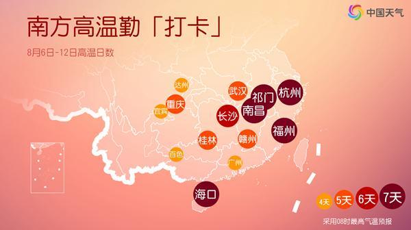 中国经历了1961年以来最热的7月之后,8月初华北南部、黄淮、四川盆地等地仍持续高温。重庆连续5天最高气温超过40℃,高温单日待机最长达到18小时,酷热难耐。从8月6日开始,我国高温将总体减弱并向南移动,北方多地高温停歇,重庆连续高温也有望中断。不过江南、华南等地高温将发展增多,需注意防暑。