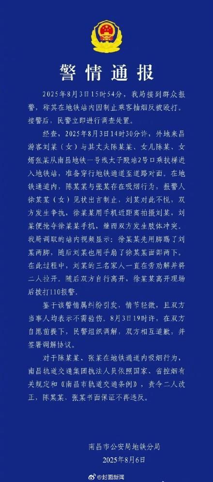 8月6日,江西省南昌市公安局地铁分局发布了一则警情通报。通报称,2025年8月3日15时54分,该局接到群众报警,称其在地铁站内因制止乘客抽烟反被殴打。