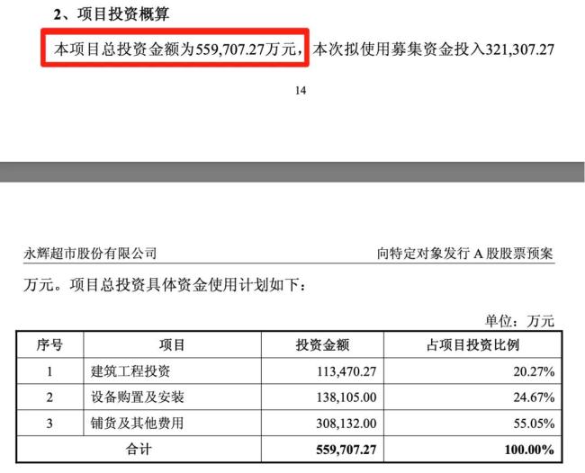 而用于该项目的资金远不止此次定增的32.13亿元,而是55.97亿元。其中,建筑工程投资、设备购置及安装、铺货及其他费用的占比分别为20.27%、24.67%和55.05%。