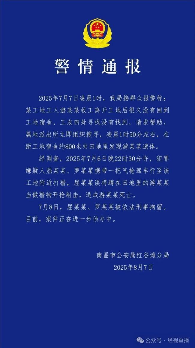 误遭枪击农民工为筹女儿婚礼钱打工 悲剧背后的家庭梦!8月7日晚间,江西省南昌市公安局红谷滩分局发布警情通报称,2025年7月7日凌晨1时,警方接到报警,某工地工人游某某离开工地后很久未回到宿舍。属地派出所立即组织搜寻,凌晨1时50分左右,在距工地宿舍约800米处的田地里发现了游某某的遗体。