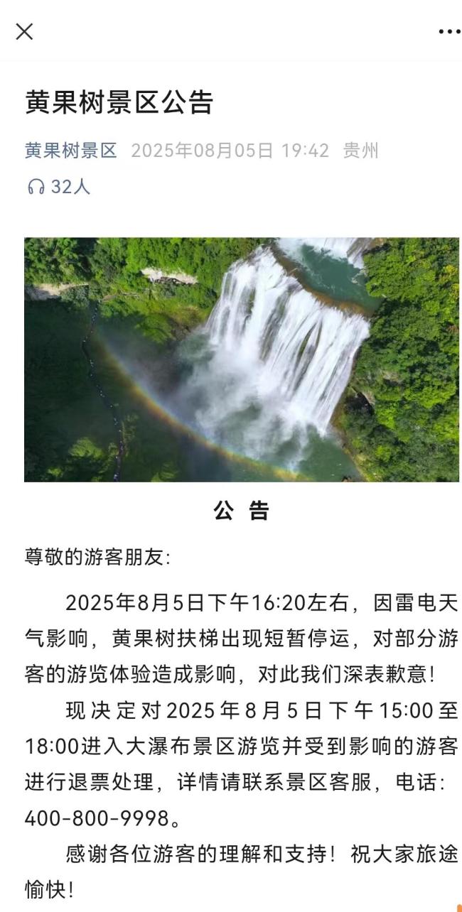 6日,黄果树景区工作人员解释称,因雷雨天气出于安全考虑停运了电梯,并对游客的游览活动造成的影响表示歉意。景区对5日下午3时至6时进入大瀑布景区并受到影响的游客进行退票处理,游客可拨打400-800-9998联系客服或添加微信进行退票。