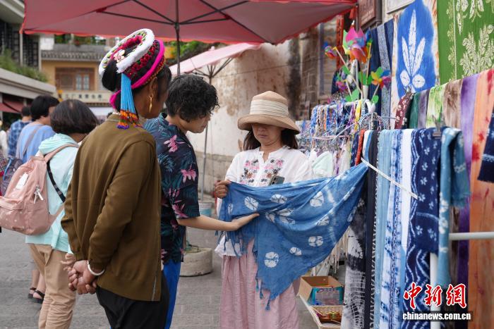 图为游客在云南省大理市喜洲镇挑选扎染服饰。白玲 摄