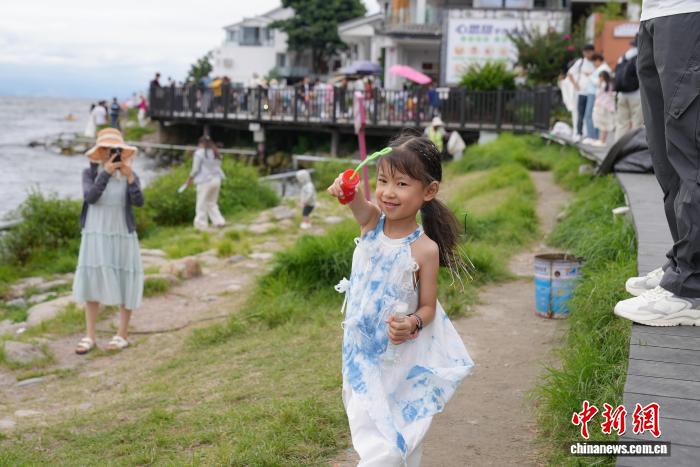 图为大理洱海生态廊道上,孩童正惬意地吹泡泡。白玲 摄