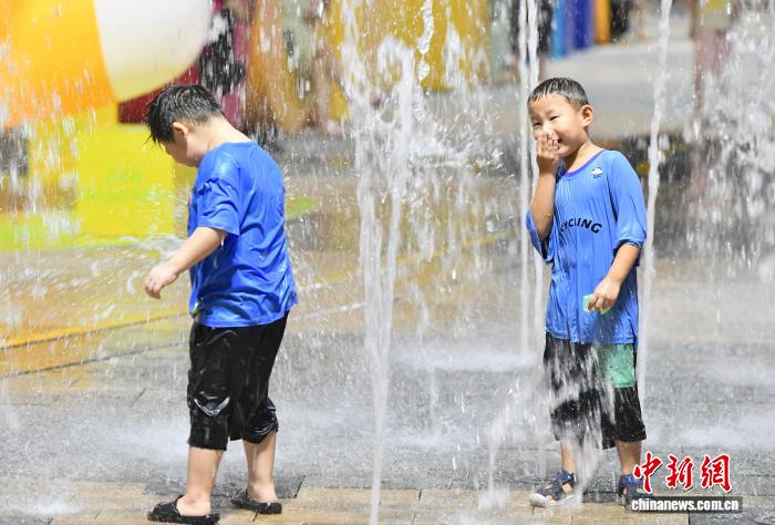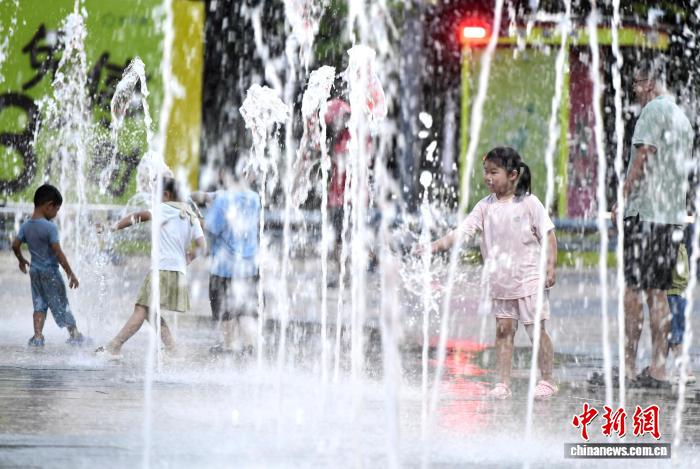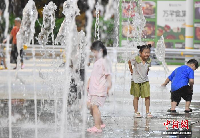 8月10日晚,小朋友在福建福州一喷泉广场戏水纳凉。中新社记者 张斌 摄