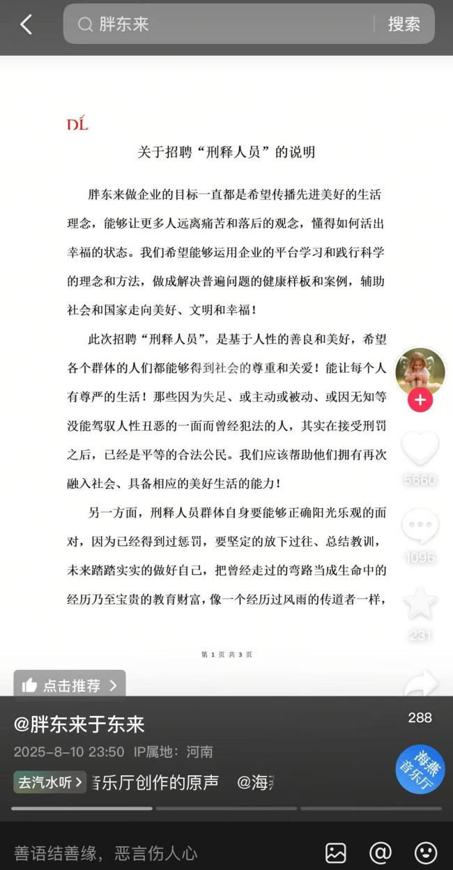 近日,胖东来计划招聘刑释人员一事引起广泛关注。8月10日晚,胖东来创始人于东来在社交平台上发布了一份关于招聘“刑释人员”的说明,进一步回应了此事。