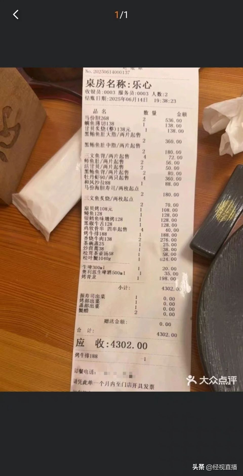 顾客日料店消费4302元引热议。