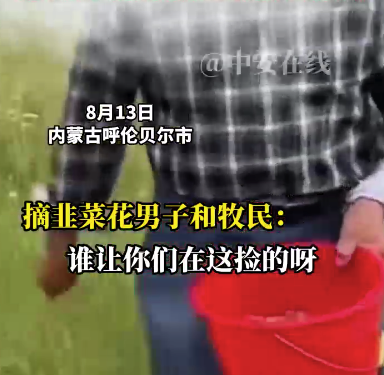 8月13日,内蒙古呼伦贝尔市。男子爬进铁丝网进入牧民院子摘韭菜花,牧民上前阻拦,对方不肯交出已经摘好的韭菜花。男子还说,院子是你家的,韭菜花不是,随后开车离开。