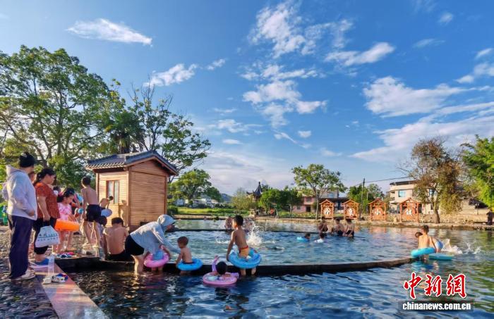正值暑假,位于福建省清流县李家乡鲜水村的“冷泉小镇”景区游人如织。不少村民推着手推车在景区穿梭售卖特色零食,与水池中人们的嬉戏画面相映成趣,构成一幅动静相宜、生活气息浓郁的民俗画卷。