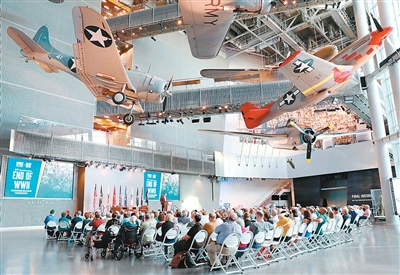 在博物馆陈列二战战机、坦克、鱼雷艇等装备的展厅,包括3名百岁高龄的二战老兵在内,约300人出席纪念仪式。许多人佩戴着馆方准备的红色虞美人绢花。