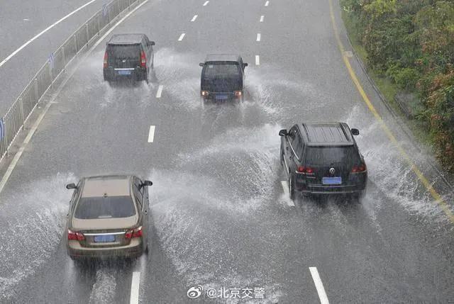 北京交警提示:雨天路滑,途经有水洼地段,请适当放慢车速。猛烈溅起的水花,容易影响相邻车道驾驶员的视线,请注意控制好车辆。