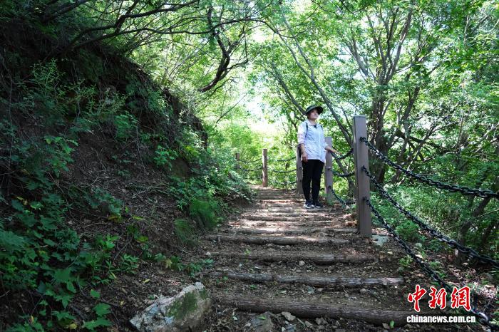 在北京密云石城镇张家坟村,有一位名叫邓玉芬的英雄母亲。在抗战烽火中,她舍家纾难,把丈夫和5个孩子送上前线,最终全部为国捐躯,用生命谱写了一曲爱国壮歌。1933年5月31日,南京国民政府和日本政府签订了丧权辱国的《塘沽协定》,邓玉芬所在的村庄被划入伪“满洲国”。为了糊口,邓玉芬一家被迫搬到村东南的猪头岭山上开荒度日。图为7月17日,邓玉芬后代任红霞带领记者重走当年邓玉芬艰难跋涉的山路,这条曾经崎岖难行的山路如今已经修缮,变得好走了很多。中新社记者 王紫儒 摄