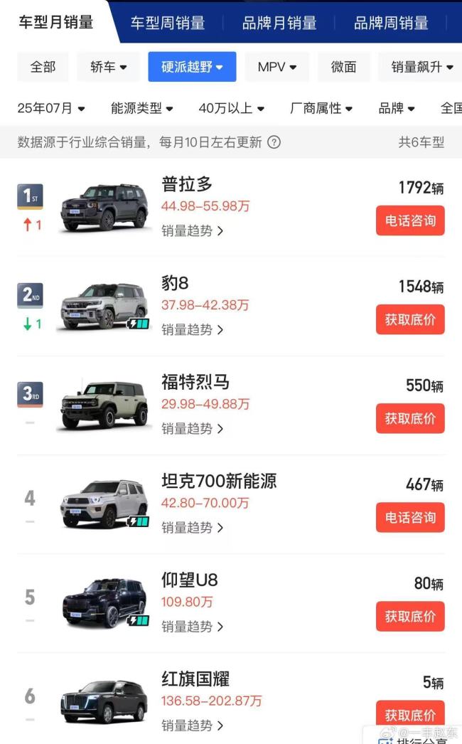 根据赵东博文附带的销量榜单显示,普拉多系列在7月的销量为1792辆。一汽丰田全新普拉多于今年2月上市,官方指导价区间为44.98万至55.98万元。新车搭载了由2.4T涡轮增压四缸发动机与电动机组成的混动系统,系统综合功率达到330马力,最大扭矩为630牛·米。传动系统匹配8速自动变速箱及全时四驱系统。