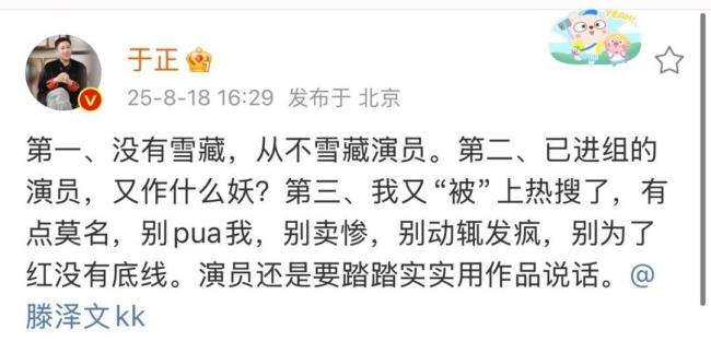 8月18日下午,于正在微博上对签约艺人滕泽文喊话,称“别pua我,别卖惨,别动辄发疯,别为了红没有底线。演员还是要踏踏实实用作品说话。”