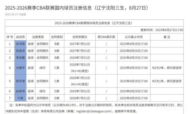 CBA官网公示辽宁男篮内援注册信息 赵继伟顶薪续约领衔。北京时间8月27日,CBA官网更新了联赛国内球员注册信息,辽宁男篮的部分球员名单已经公布。在这份名单中,辽宁男篮公示了7名球员,其中包括赵继伟和付豪两位顶薪球员的续约情况。近期传言中的姜宇星尚未出现在注册名单上,而吴昌泽已从吉林男篮回归球队,刘雁宇则完成了C类合同的续约。
