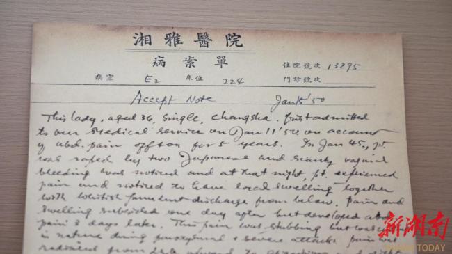 病历上记载,1950年1月11日,36岁的长沙市民熊女士因“双侧输卵管炎”来到湘雅医院治疗。经医生询问得知,她的病痛起源于日军占领长沙期间。