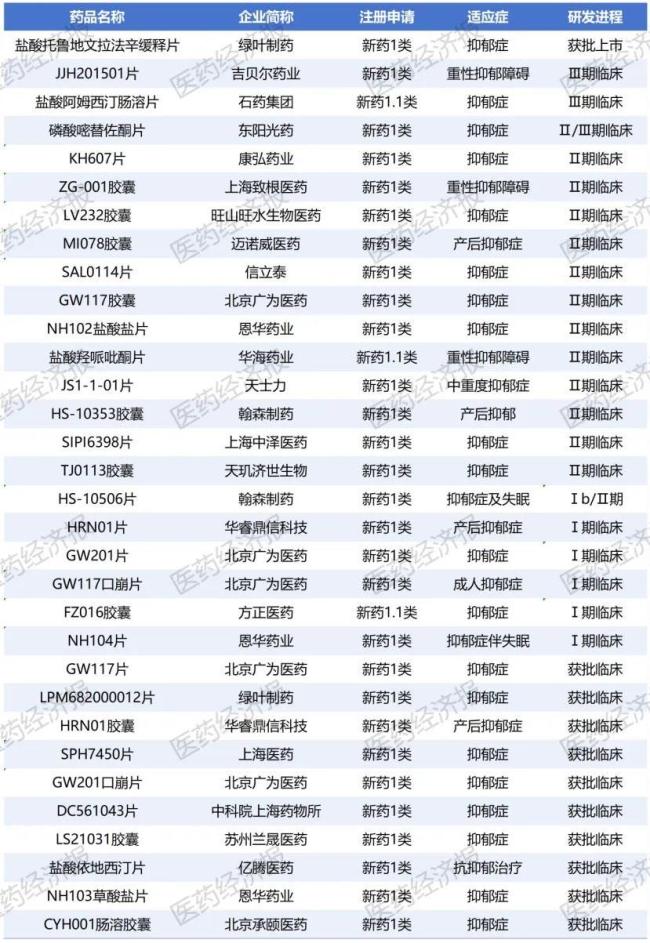 纵观细分领域,日益拥挤的仿制药赛道,叠加集采“大降价”的影响,更多的本土药企已纷纷把目光投向抗抑郁创新药的开发上。据不完全统计,目前国内已有至少32款国产抗抑郁1类化药新药处于获批临床及以上阶段,涉及石药集团、翰森制药、上海医药、华海药业、天士力、东阳光药等20余家药企。