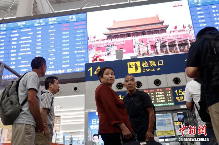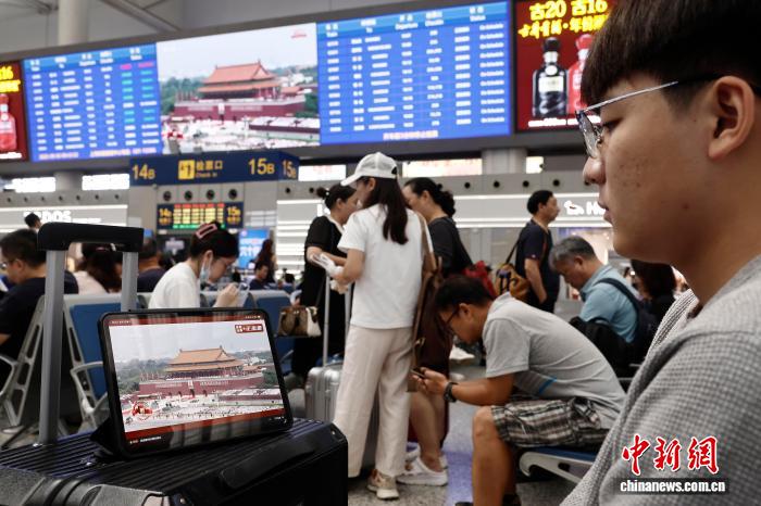 (抗战胜利80周年)上海:旅客观看纪念中国人民抗日战争暨世界反法西斯战争胜利80周年大会直播