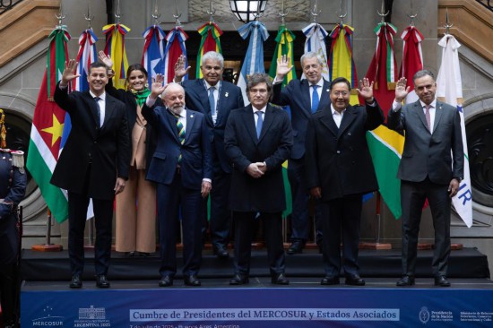 7月3日,在阿根廷首都布宜诺斯艾利斯,南方共同市场第66次首脑会议与会领导人在会议现场合影。新华社发(马丁·萨巴拉摄)