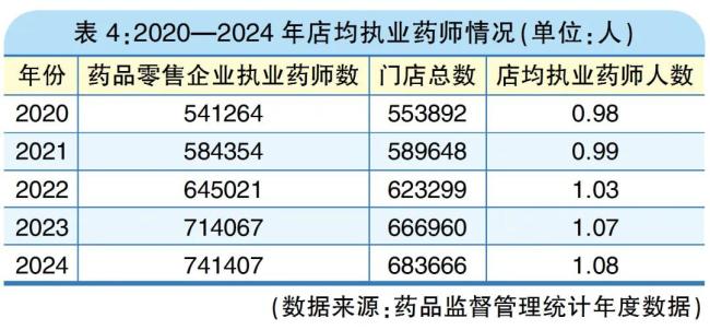 根据药品监管统计年度数据,我国执业药师人数从2020年的59.42万人增长到2024年的81.43万人,同比增长37.5%,零售药店执业药师人数也从54.13万人增长至74.14万人,店均执业药师从不足1人增长至1.09人。按《关于规范药品零售企业配备使用执业药师的通知》要求,2025年底前,全国所有药店要完成执业药师的配备。从数量来看,实现每家药店配备一名执业药师的要求和目标有了基本保障。
