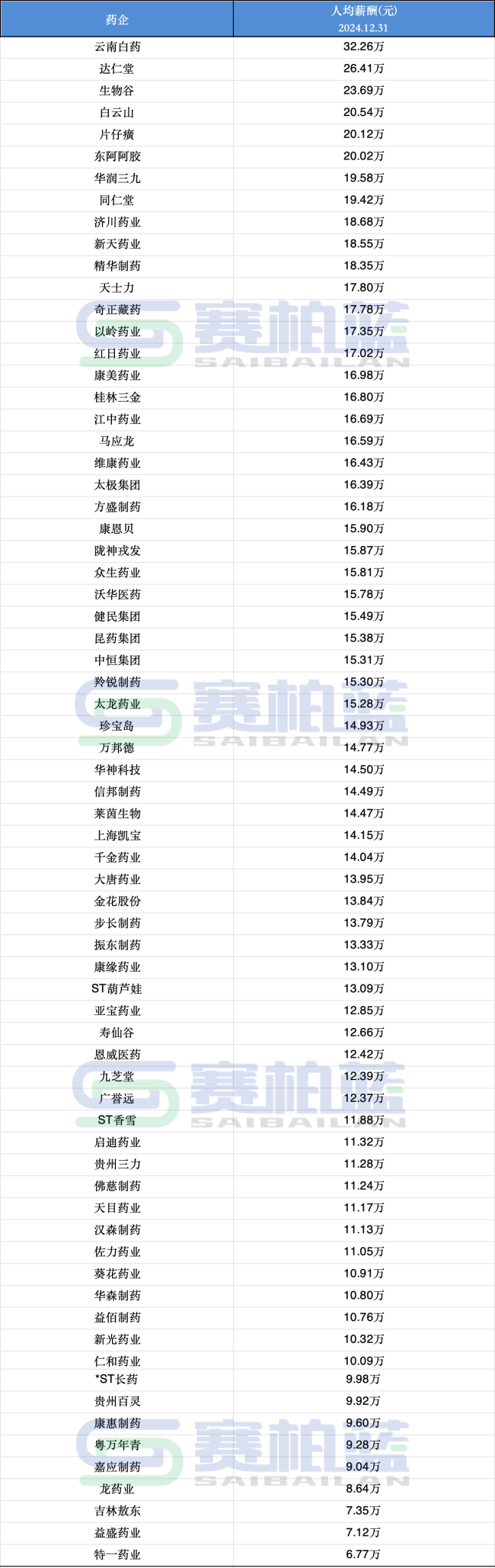 前十企业中共有6家人均薪酬突破20万元,其中云南白药以约32.26万元的水平稳居榜首,达仁堂、生物谷等企业紧随其后,占据中药板块薪酬第一梯队。