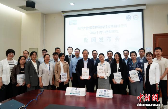 新闻发布会上,可持续发展大数据国际研究中心主任郭华东院士及项目团队代表合影。中新网记者 孙自法 摄