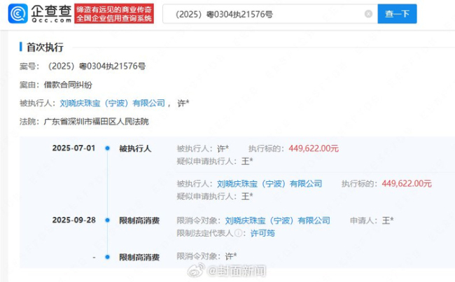 举报人申请限消刘晓庆珠宝 公司已被强制更名!王某起诉刘晓庆珠宝(宁波)有限公司等借款合同纠纷一案近日更新,因未按指定期间履行给付义务,该公司及其法定代表人许可筠被限制高消费。此前,王某曾对刘晓庆及相关企业税务问题进行举报,但国家税务总局上海市税务局第四稽查局检查后表示,未发现举报所反映的涉税问题。