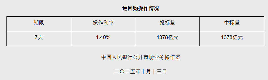中新网10月13日电 据央行网站消息,2025年10月13日中国人民银行以固定利率、数量招标方式开展了1378亿元7天期逆回购操作。具体情况如下: