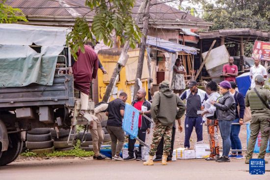 10月12日,在喀麦隆西南大区首府布埃亚,选举工作人员和安保人员在投票站开放前准备投票材料。新华社发(穆朗·廷古姆摄)