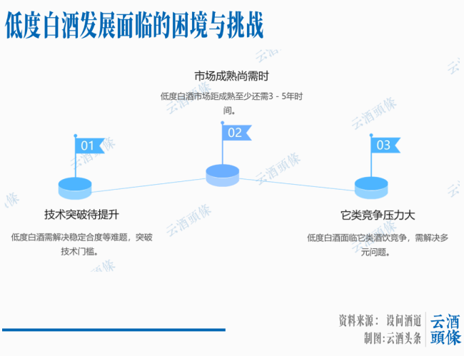 对于长期以高度酒为价值标杆和市场主导的传统白酒来说,低度酒的认知教育、产品价值的提升、品牌阵营的形成等还需要行业投入较大的精力。因此低度白酒距离市场成熟至少还需要3-5年的路要走。