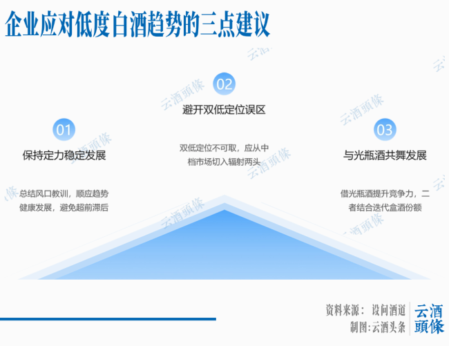 上述分析表明,虽然白酒低度化是谁未来的消费趋势,但要成为有生命力的可持续发展的新品类还有相当长的路要走。那么,面对低度白酒这个趋势企业该如何?这里提出三点建议供企业决策参考。
