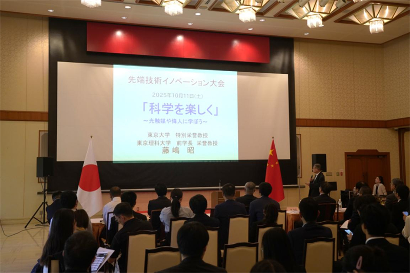 人民网东京10月15日电 (记者朱玥颖)近日,2025年“国际产学研杯”前沿科技创新大赛决赛在中国驻福冈总领馆举行。中国驻福冈总领事杨庆东、国际产学研促进会会长董发明出席活动并致辞,特邀东京大学特别荣誉教授藤岛昭做演讲,国家卫健委老年医学研究所所长蔡剑平、中国驻福冈总领馆副总领事成岩及来自中日科研学术界、企业界等约70人参加。