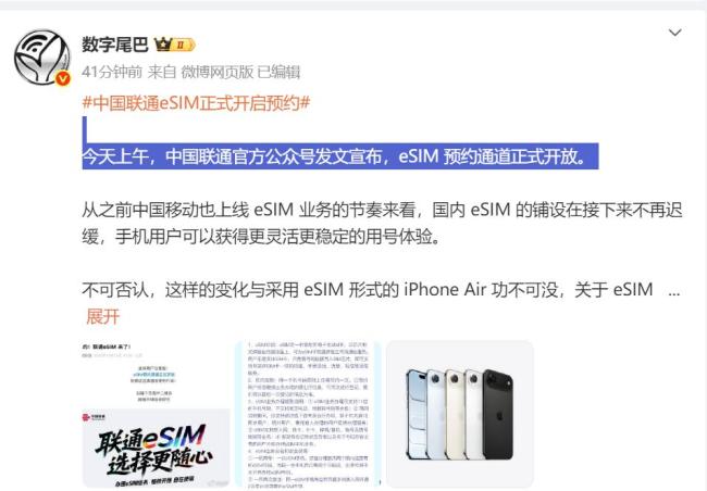 数码博主“数字尾巴”指出,eSIM技术将带来更灵活稳定的用号体验。中国联通开放预约标志着手机通信方式的重要变革。