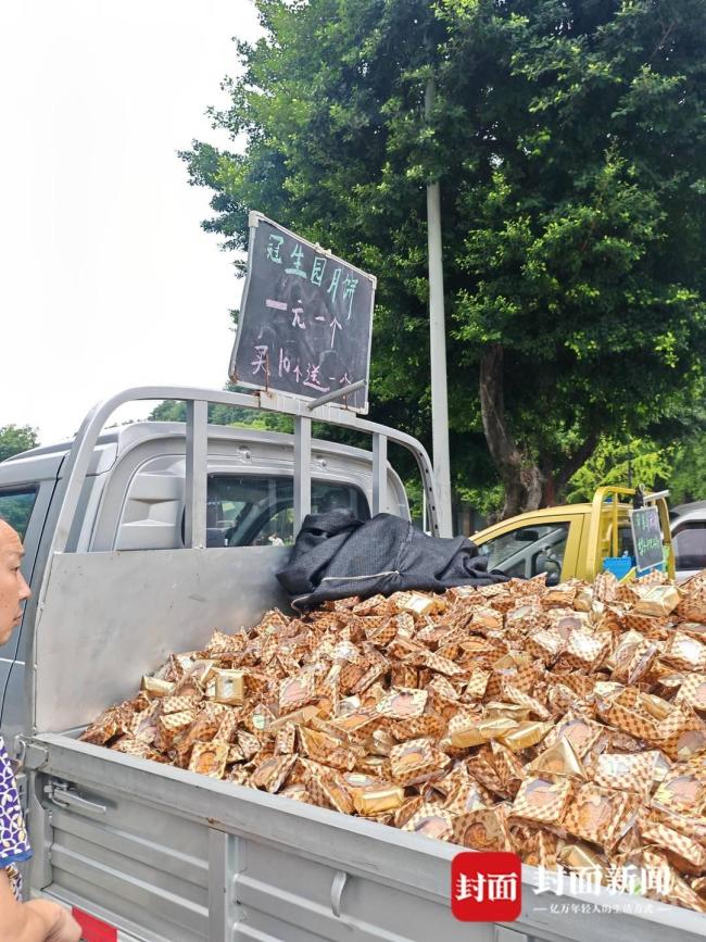 摊主透露,每年中秋节后,厂家会将退回的礼盒月饼拆开打包批发给商贩,再由商贩在街头销售。他表示,一车2000斤的月饼已经卖得只剩下两百来斤,有人买回去吃,有人用来喂狗,还有人说要将月饼馅抠出来做甜品。