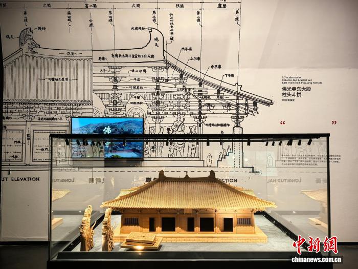 置身“古建寻迹”展厅,仿佛进入一座“中国古建筑宝库”,这里陈列着中国古建筑学家梁思成的手稿,以及中国唐代建筑佛光寺、南禅寺的木雕模型,让观众近距离观察古代匠人的智慧。从云冈石窟到应县木塔,从晋祠到小西天,从北魏至明清的古建演变脉络,在此变得清晰。