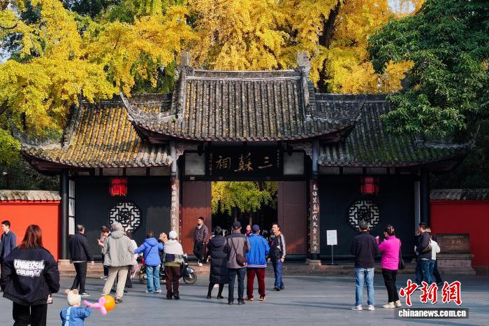 11月24日,初冬暖阳下,四川省眉山市东坡区纱縠行南街的三苏祠博物馆南门内,高大的银杏树渐染金黄,金黄叶片随风轻舞,吸引不少游客驻足观赏、拍照留念,现场洋溢着浓浓的诗意与雅致氛围。图为三苏祠南门游客。中新社记者 刘忠俊 摄