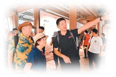 程吕底亚家族后人程高登夫妇(左一、左二)了解鼓岭建筑历史。