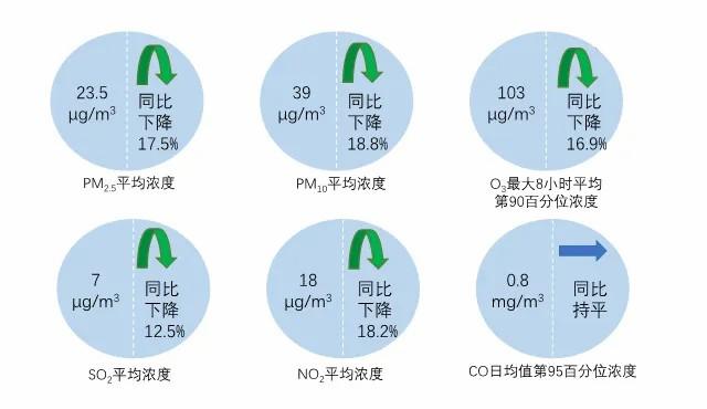 10月,全国339个地级及以上城市PM2.5平均浓度为23.5微克/立方米,同比下降17.5%;PM10平均浓度为39微克/立方米,同比下降18.8%;O3平均浓度为103微克/立方米,同比下降16.9%;SO2平均浓度为7微克/立方米,同比下降12.5%;NO2平均浓度为18微克/立方米,同比下降18.2%;CO平均浓度为0.8毫克/立方米,同比持平。