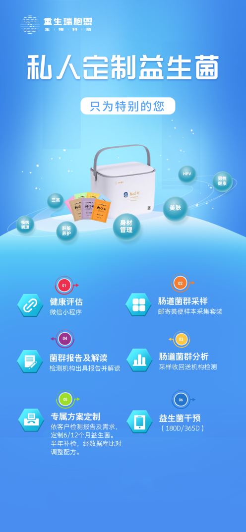 好的技术和产品,最终目的是让更多人受益。为此,重生瑞胞恩创新推出“私人定制益生菌服务”,将“千人千菌”的科学理念转化为可落地的全流程服务体系,彻底打破传统益生菌“一刀切”的局限,精准应对“三高”调理、肝脏养护、男性健康管理等多样化个体需求。