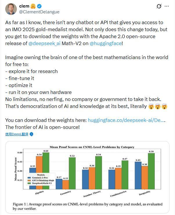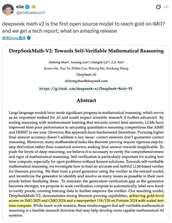 昨日,DeepSeek宣布推出其最新的数学推理模型DeepSeekMath-V2。该模型在模拟的2025年国际数学奥林匹克竞赛(IMO)中解决了6个问题中的5个,达到了金牌水平。这一成就使其成为第一个在IMO级别竞赛中获得金牌的开源模型,引发了AI研究和开发者社区的高度关注。