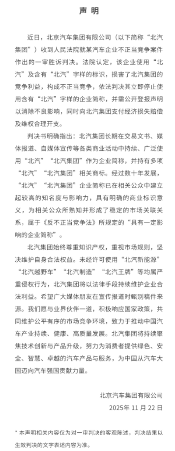 一周前的11月22日,北汽集团曾发布声明表示,近日,北京汽车集团有限公司收到人民法院就某汽车企业不正当竞争案件作出的一审胜诉判决。法院认定,该企业使用“北汽”及含有“北汽”字样的标识,损害了北汽集团的竞争利益,构成不正当竞争,依法判决其立即停止使用含有“北汽”字样的企业简称,并需公开登报声明以消除不良影响,同时向北汽集团支付经济损失赔偿及维权合理开支。