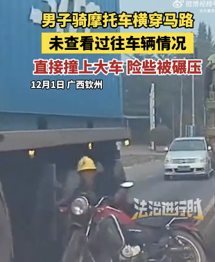摩托车横穿马路撞上大车险遭碾压。12月1日,广西钦州。男子骑摩托车横穿马路,未查看过往车辆情况直接撞上大车,险些被碾压。