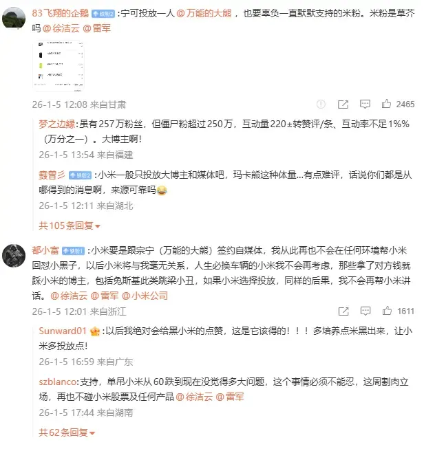 据了解,此次事件涉及的博主是“万能的大熊”,因其长期被视为“反米先锋”,曾嘲讽米粉群体及推广伪科学产品,此前还因编造谣言被判赔偿联想16万元。在徐洁云和雷军的微博下,许多网友留言抵制,表示支持小米与其他博主的合作,但不能与每天抹黑小米的大V合作。
